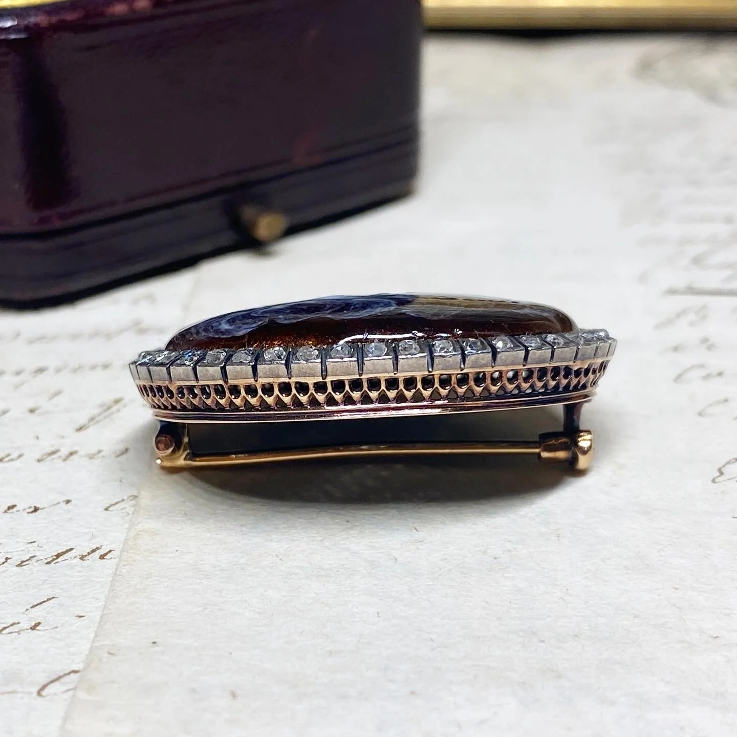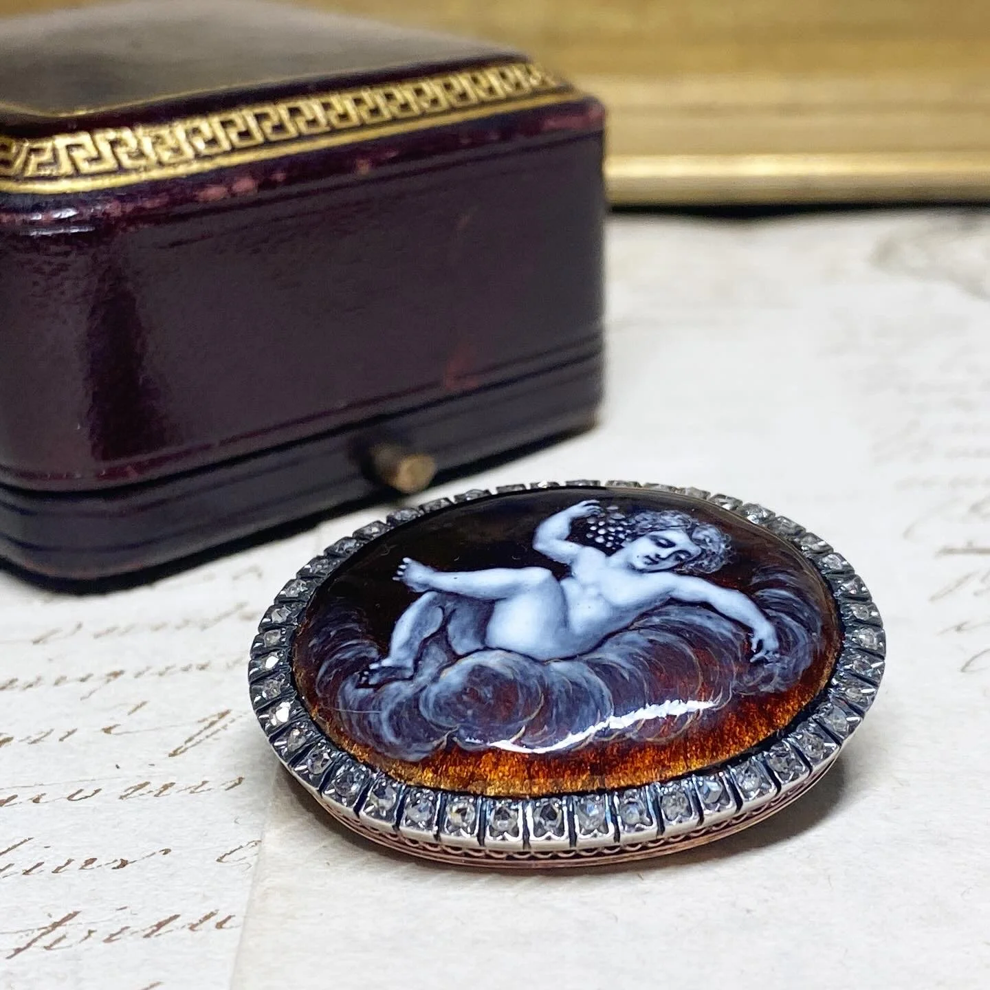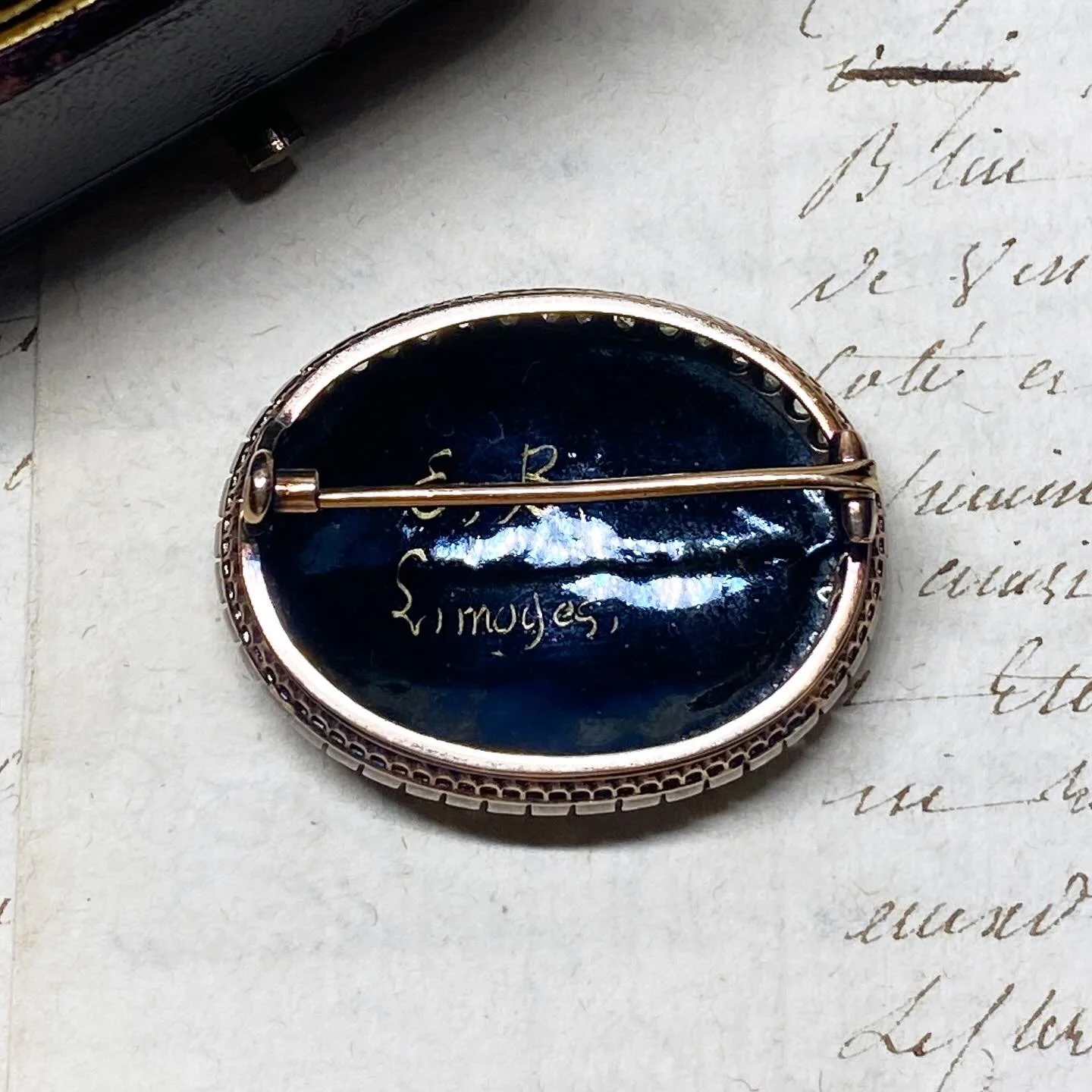 A very fine brooch in 18kt rose gold and silver set with an enamel from limoges and rose-cut diamonds.